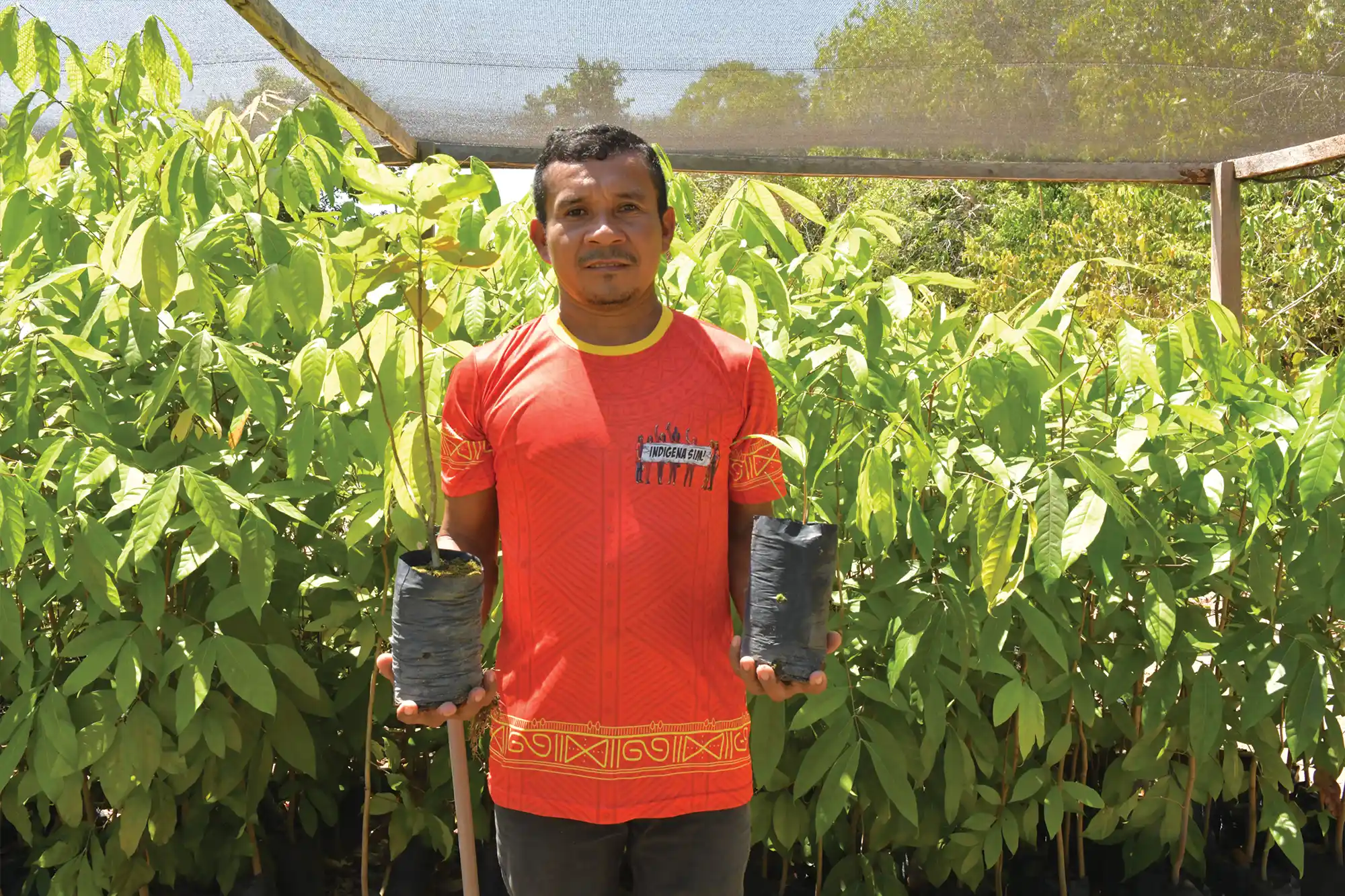 Jessé também guia Radis pelo viveiro de mudas de árvores nativas com orgulho. A estrutura com canteiros separados entre as espécies e proteção contra a luz solar conta com irrigação automatizada, fruto do sistema de abastecimento de água potável e da energia solar. A comunidade faz um sistema de rodízio entre as famílias para realizarem o cuidado do viveiro.